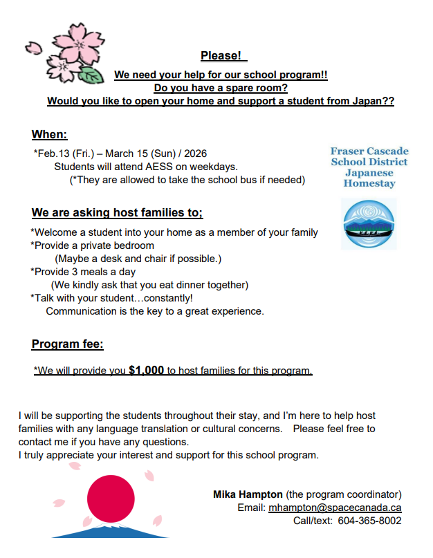It’s that time of the year where Agassiz families have the opportunity to welcome Japanese high school students into their home while they attend Agassiz Secondary from mid February to mid March. Please check out the flyer for more information. Please contact Meka Hampton for more information… 604-365-8002